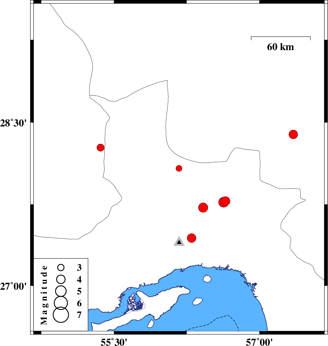 | 2013/02/16 | 13:09:05.1 | 16:39:05.1 | 28.39 | 57.35 | 14 | ML4.1 | Kerman Province, 49 km South-West of Jiroft | ||