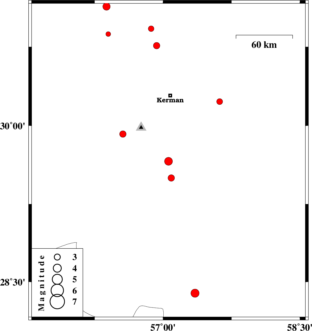 | 2013/02/16 | 13:09:05.1 | 16:39:05.1 | 28.39 | 57.35 | 14 | ML4.1 | Kerman Province, 49 km South-West of Jiroft | ||