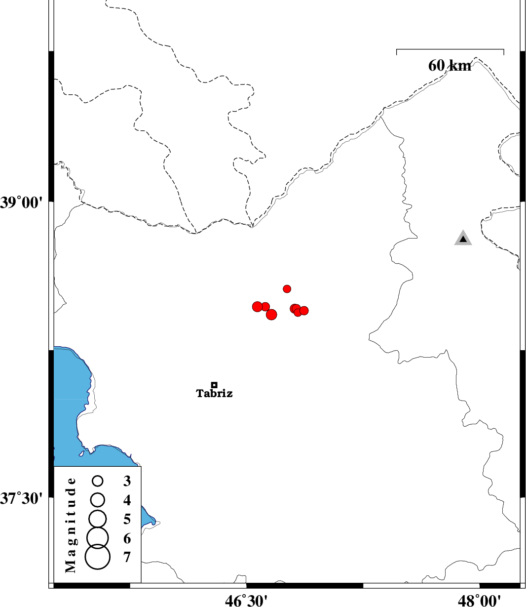 | 2013/02/15 | 06:02:06.3 | 09:32:06.3 | 38.47 | 46.62 | 44 | ML2.5 | Azarbaijan Sharghi Province, 40 km West of Ahar |