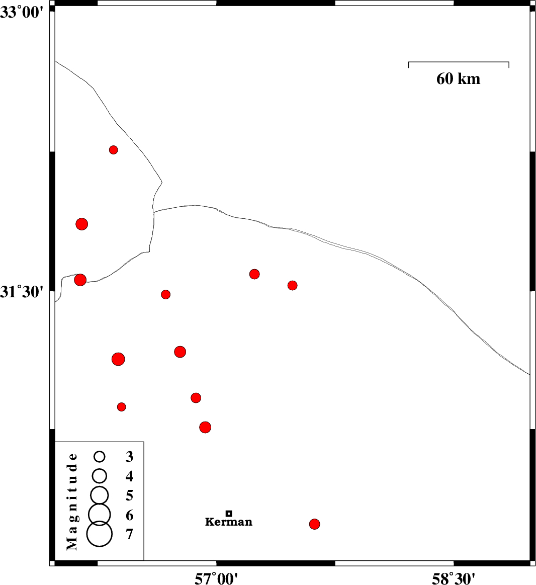 | 2013/01/24 | 11:40:23.1 | 15:10:23.1 | 30.76 | 56.93 | 18 | ML3.2 | Kerman Province, 35 km East of Zarand |