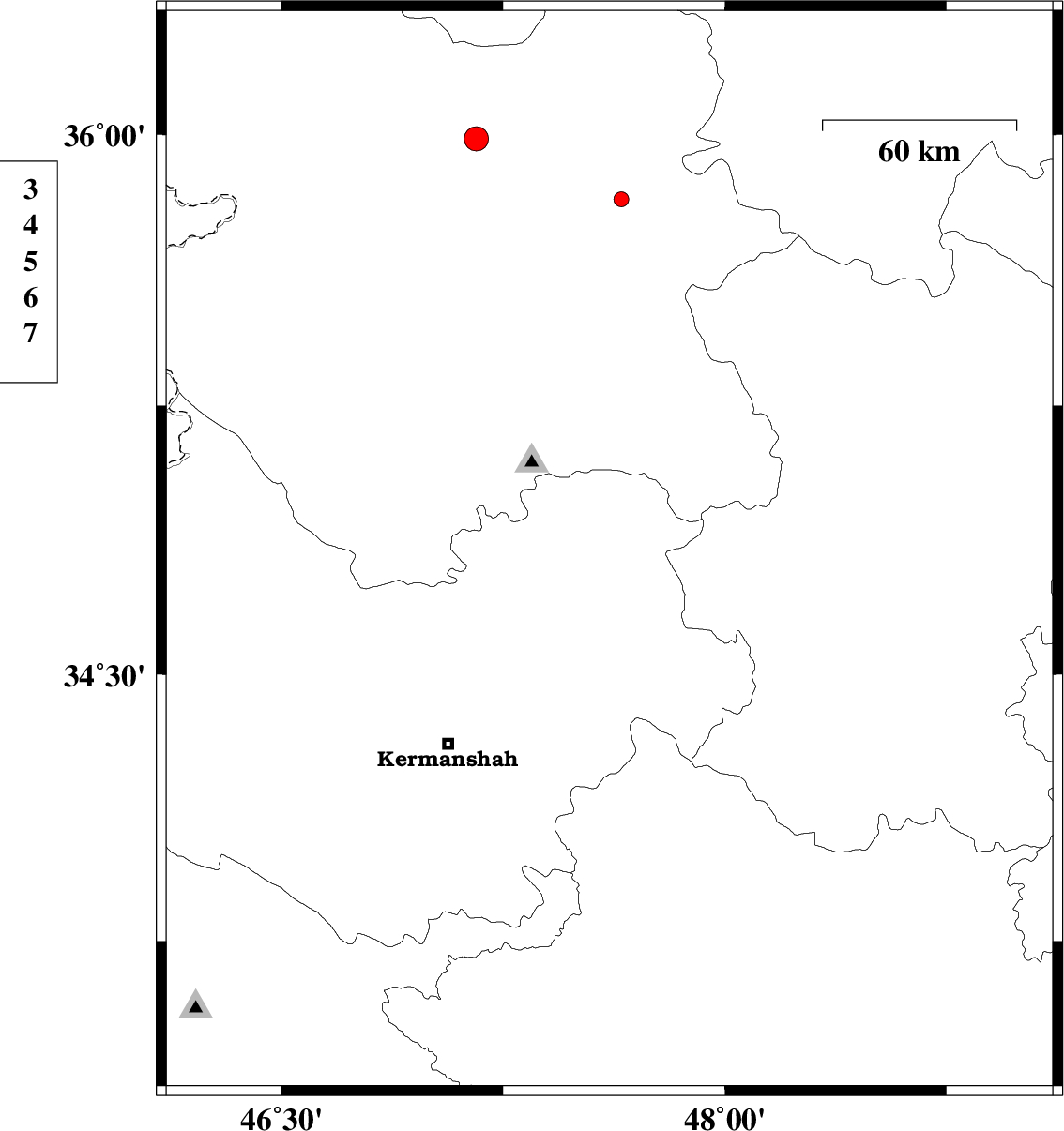 | 2013/02/23 | 19:27:23.6 | 22:57:23.6 | 34.84 | 47.61 | 14 | ML2.3 | Kermanshah Province, 7 km Sonqor | ||