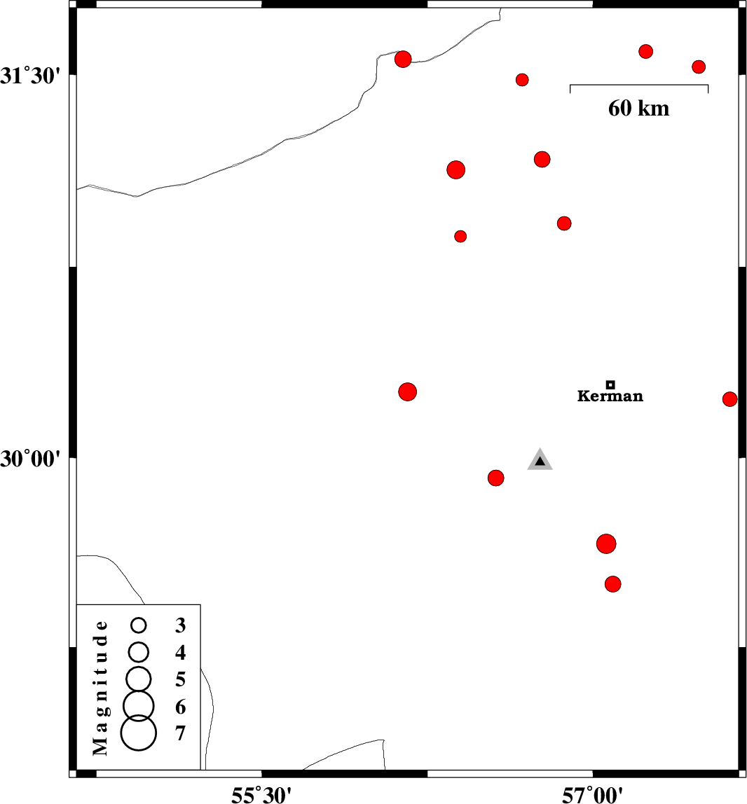 | 2013/02/22 | 01:39:24.4 | 05:09:24.4 | 29.66 | 57.06 | 16 | ML4 | Kerman Province, 70 km South of Kerman | ||