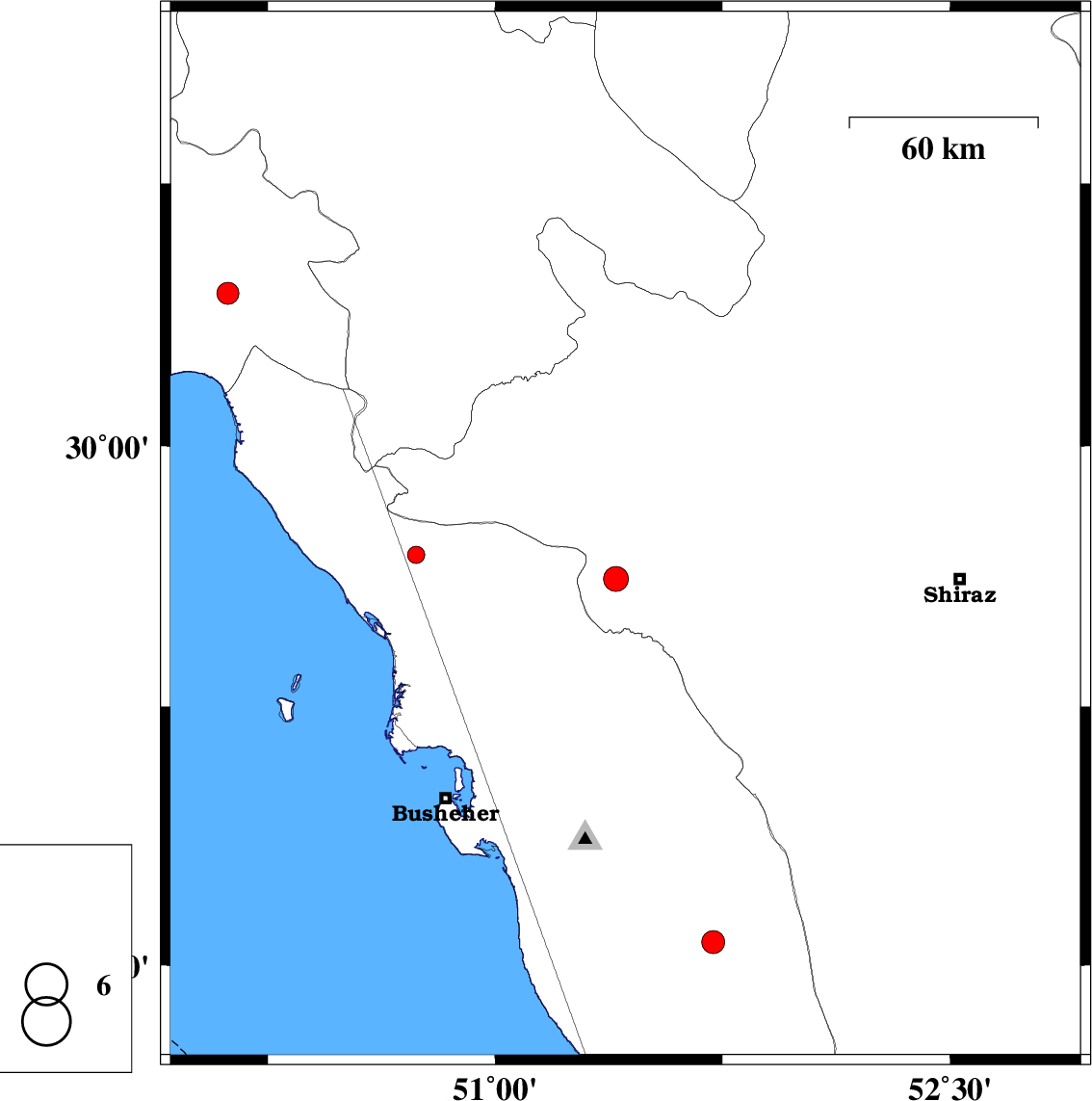 | 2013/02/26 | 00:54:54.3 | 04:24:54.3 | 29.74 | 51.43 | 18 | ML2.5 | Fars Province, 26 km North-West of Kazerun | ||