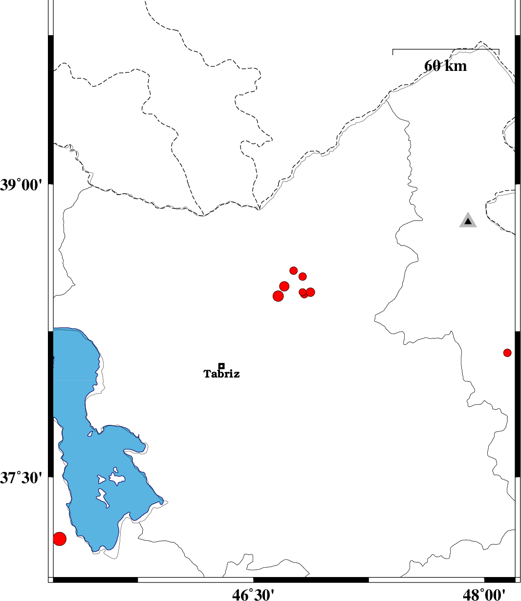 | 2013/02/20 | 10:36:52.9 | 14:06:52.9 | 38.45 | 46.87 | 14 | ML2.6 | Azarbaijan Sharghi Province, 18 km West of Ahar | ||