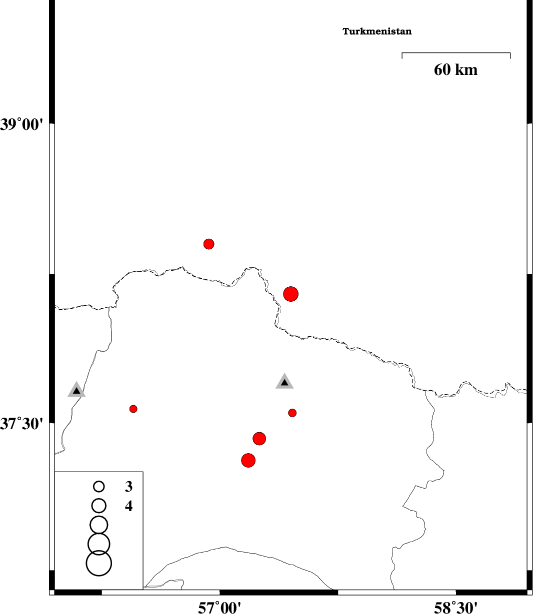 | 2013/02/12 | 12:26:58.1 | 15:56:58.1 | 37.31 | 57.18 | 25 | ML3.9 | Khorasan(north) Province, 23 km South-West of Bojnurd | ||