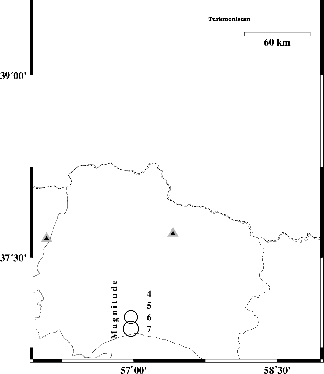 | 2013/02/28 | 11:06:02.4 | 14:36:02.4 | 38.15 | 57.45 | 16 | ML4.2 | 76 km North-East of Bojnurd |