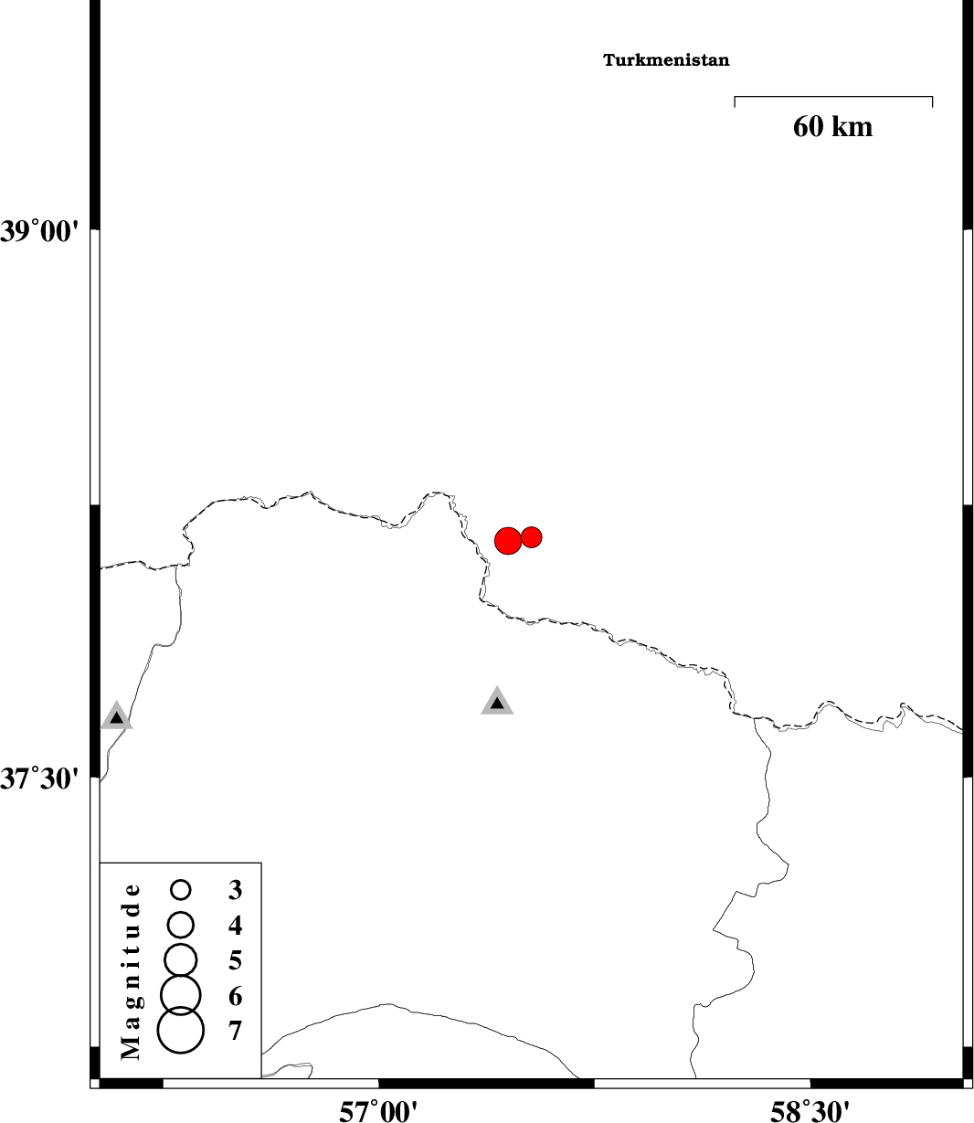 | 2013/02/28 | 11:06:02.4 | 14:36:02.4 | 38.15 | 57.45 | 16 | ML4.2 | 76 km North-East of Bojnurd |