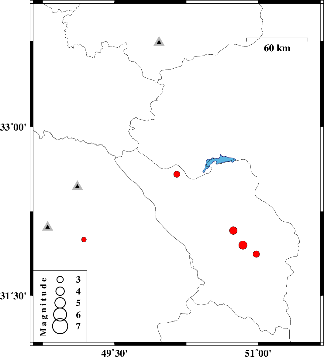 | 2013/03/02 | 19:24:30.1 | 22:54:30.1 | 31.95 | 50.84 | 14 | ML3.9 | Chaharmahal Bakhtiari Province, 18 km East of Ardel | ||