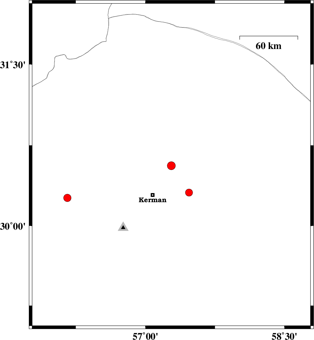 | 2013/03/03 | 16:11:13.8 | 19:41:13.8 | 30.56 | 57.28 | 14 | ML3.9 | Kerman Province, 36 km North-East of Kerman | ||