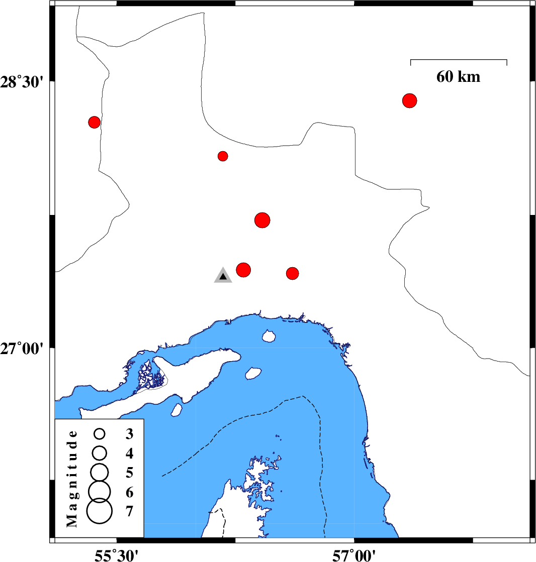 | 2013/02/21 | 02:08:25.6 | 05:38:25.6 | 28.08 | 56.17 | 17 | ML2.8 | Hormozgan Province, 37 km South-East of Hajiabad | ||