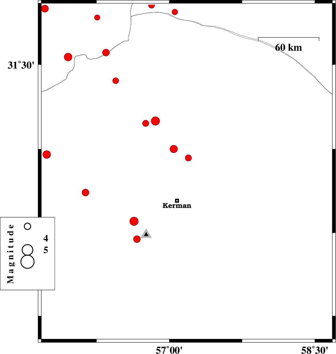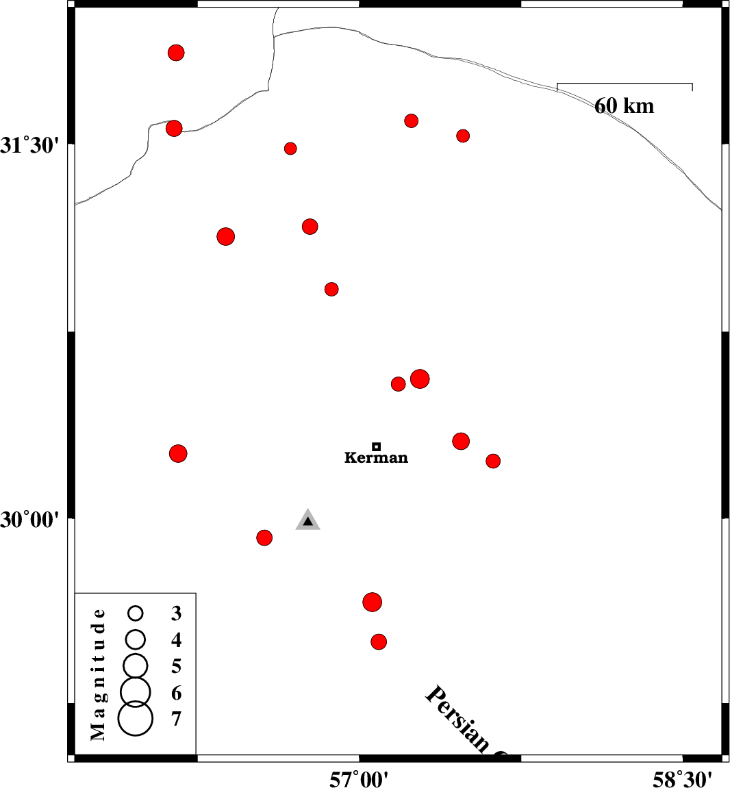| 2013/02/23 | 21:16:08.9 | 00:46:08.9 | 31.59 | 57.24 | 16 | ML2.8 | Kerman Province, 54 km North-East of Ravar | ||