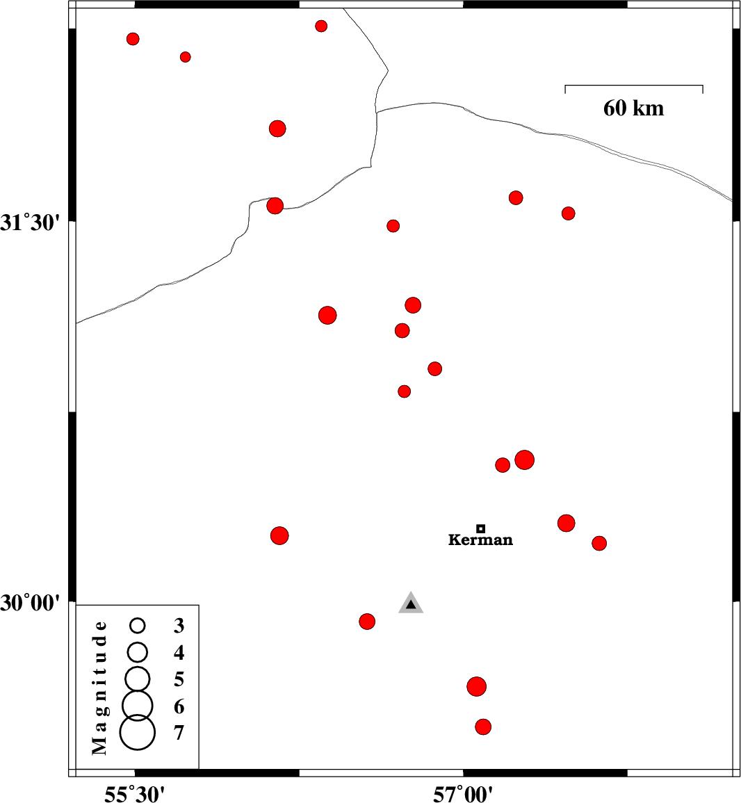 | 2013/02/22 | 01:39:24.4 | 05:09:24.4 | 29.66 | 57.06 | 16 | ML4 | Kerman Province, 70 km South of Kerman | ||
