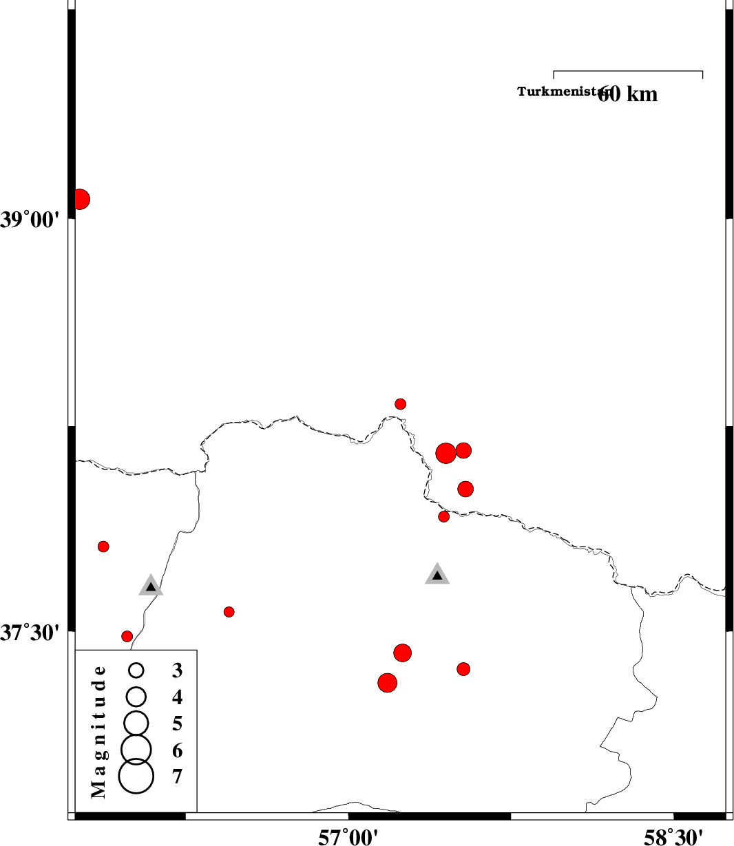 | 2013/03/02 | 00:32:59.9 | 04:02:59.9 | 37.92 | 57.44 | 23 | ML2.2 | Khorasan(north) Province, 50 km North-East of Bojnurd | ||