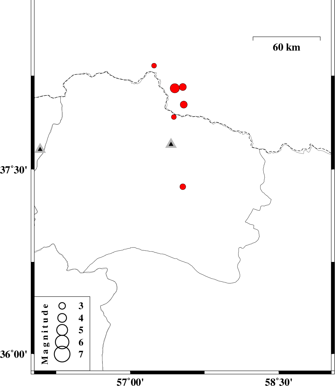 | 2013/03/02 | 00:32:59.9 | 04:02:59.9 | 37.92 | 57.44 | 23 | ML2.2 | Khorasan(north) Province, 50 km North-East of Bojnurd | ||