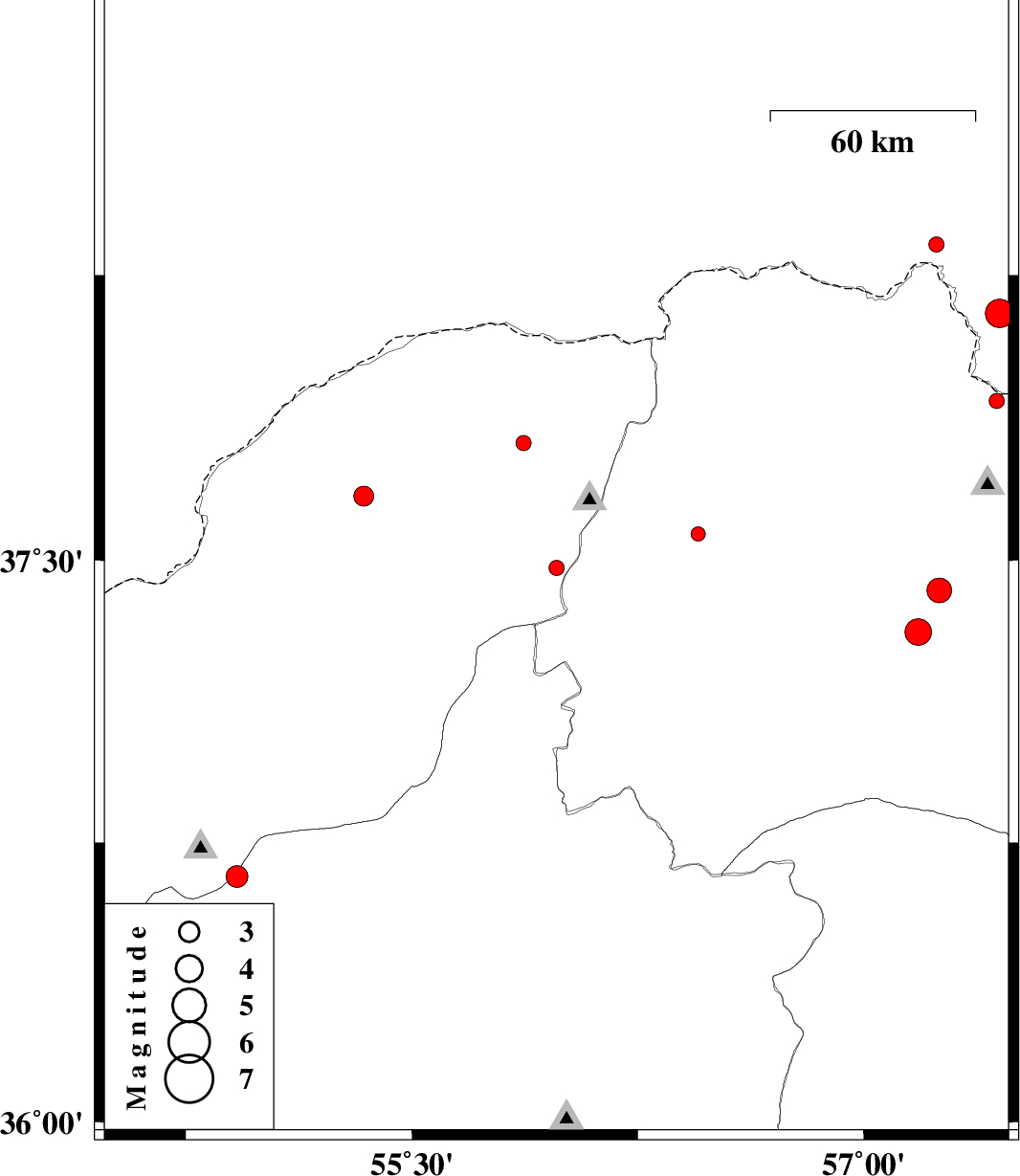 | 2013/03/02 | 00:32:59.9 | 04:02:59.9 | 37.92 | 57.44 | 23 | ML2.2 | Khorasan(north) Province, 50 km North-East of Bojnurd | ||