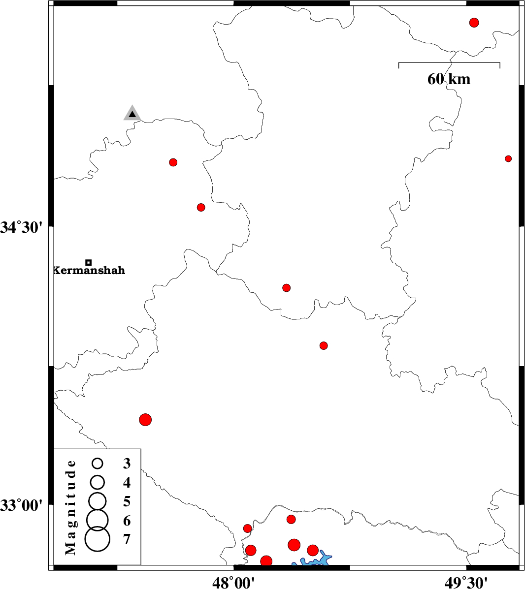 | 2013/02/23 | 19:27:23.6 | 22:57:23.6 | 34.84 | 47.61 | 14 | ML2.3 | Kermanshah Province, 7 km Sonqor | ||
