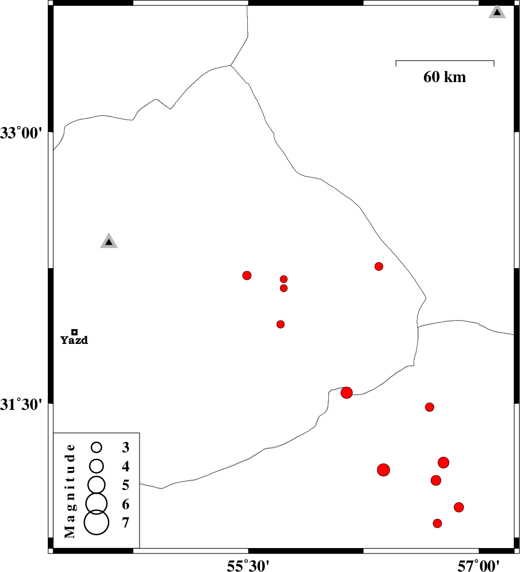 | 2013/03/09 | 13:23:19.8 | 16:53:19.8 | 31.94 | 55.71 | 14 | ML2.2 | Yazd Province, 47 km North-East of Bafq | ||