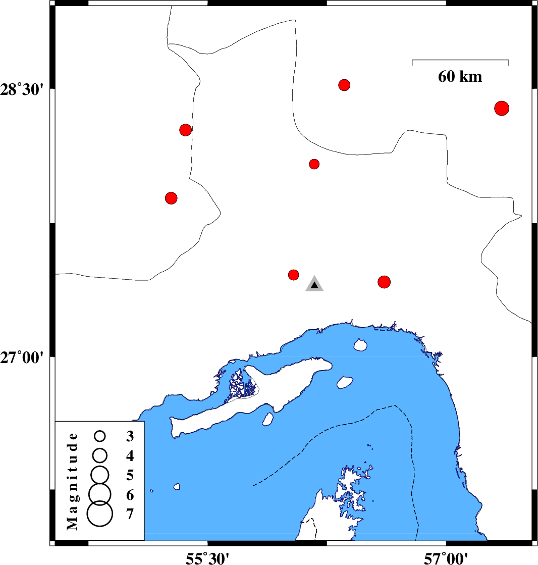 | 2013/02/16 | 13:09:05.1 | 16:39:05.1 | 28.39 | 57.35 | 14 | ML4.1 | Kerman Province, 49 km South-West of Jiroft |