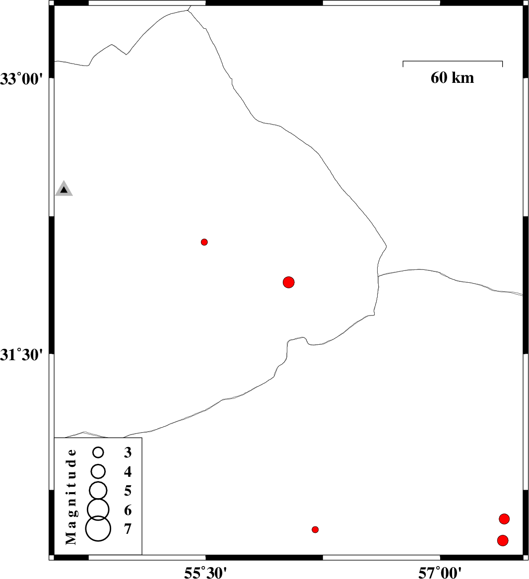 | 2013/03/13 | 09:16:47.3 | 12:46:47.3 | 30.59 | 57.41 | 14 | ML2.9 | Kerman Province, 46 km North-East of Kerman |