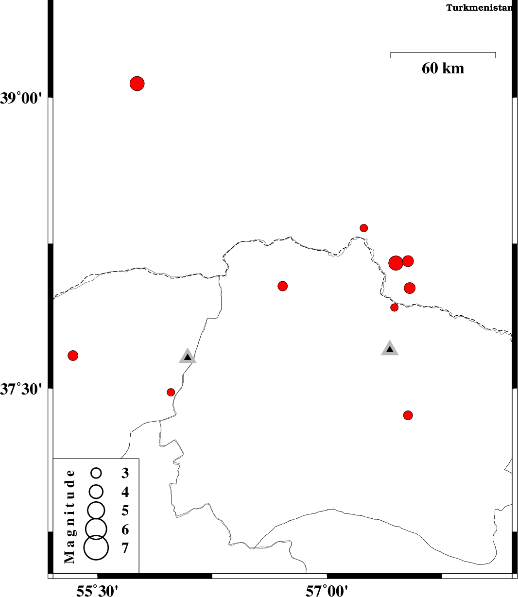 | 2013/03/02 | 00:32:59.9 | 04:02:59.9 | 37.92 | 57.44 | 23 | ML2.2 | Khorasan(north) Province, 50 km North-East of Bojnurd | ||