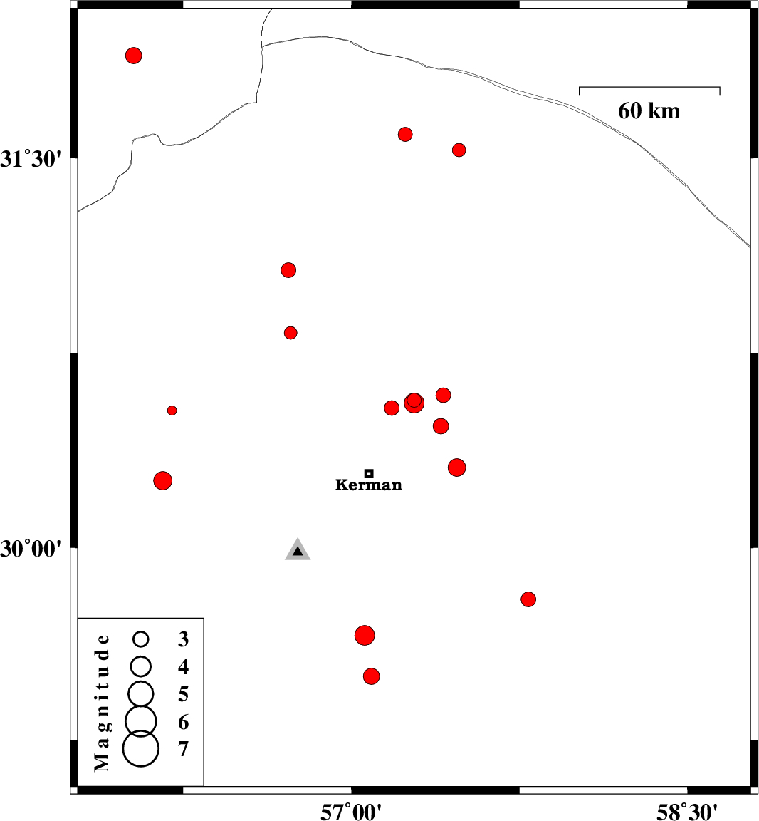 | 2013/02/22 | 01:39:24.4 | 05:09:24.4 | 29.66 | 57.06 | 16 | ML4 | Kerman Province, 70 km South of Kerman |