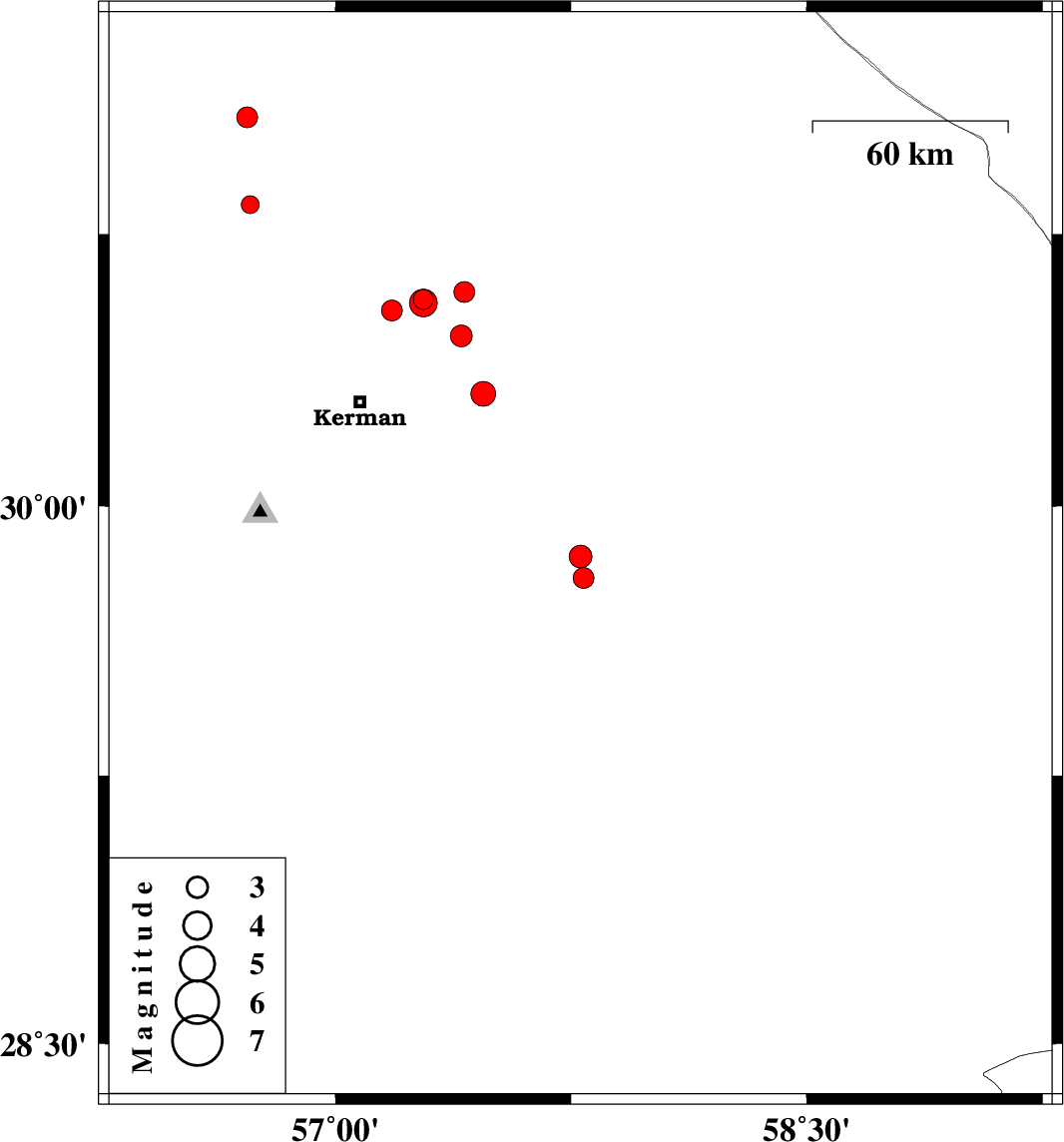 | 2013/03/11 | 13:30:43.4 | 17:00:43.4 | 29.8 | 57.79 | 14 | ML3 | Kerman Province, 126 km North of Jiroft | ||