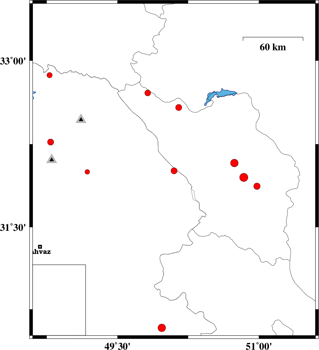 | 2013/03/09 | 02:07:43.3 | 05:37:43.3 | 32.27 | 48.79 | 14 | ML3 | Khoozestan Province, 26 km North of Shushtar | ||