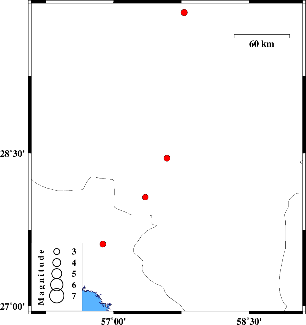 | 2013/03/28 | 03:27:12.1 | 07:57:12.1 | 28.45 | 57.59 | 14 | ML3.1 | Kerman Province, 29 km South-West of Jiroft | ||