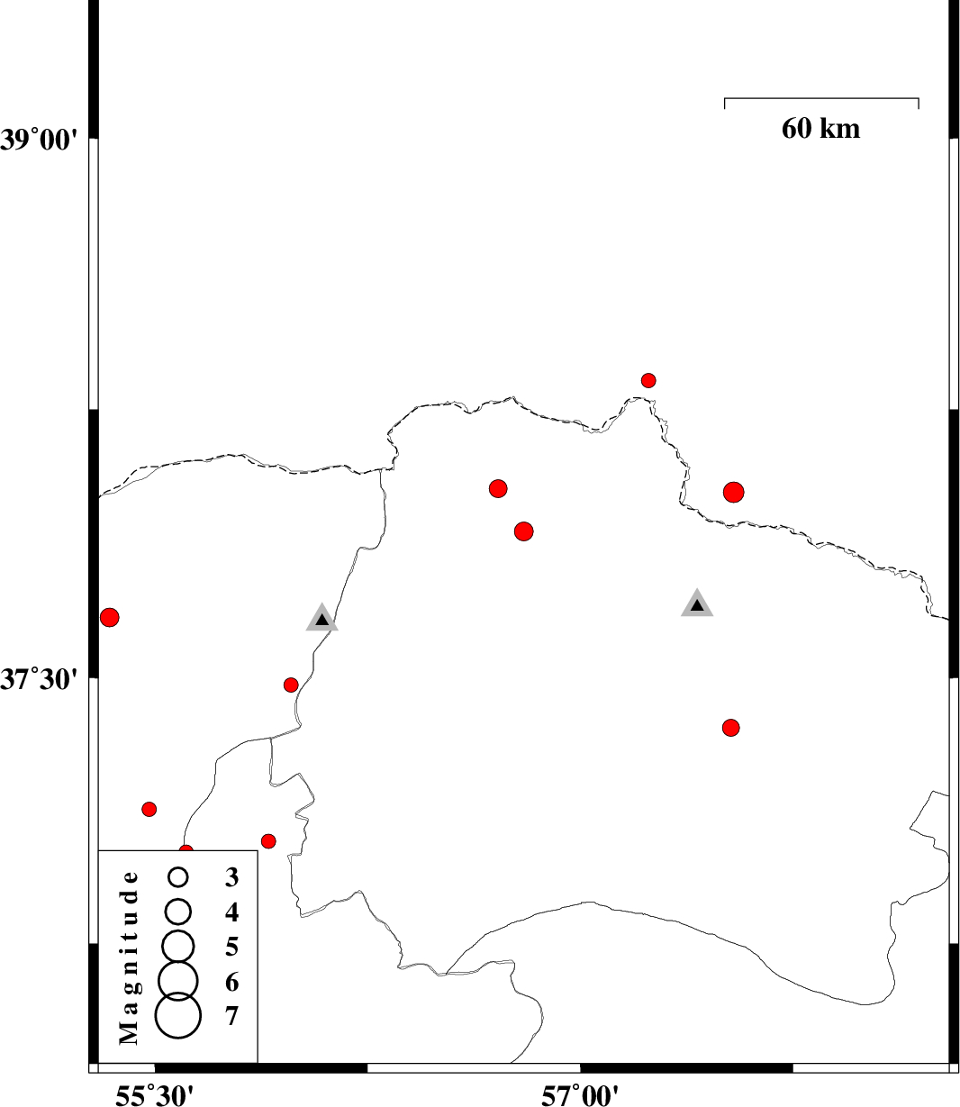 | 2013/03/04 | 14:45:47.4 | 18:15:47.4 | 38.02 | 57.54 | 21 | ML3.3 | 63 km North-East of Bojnurd |