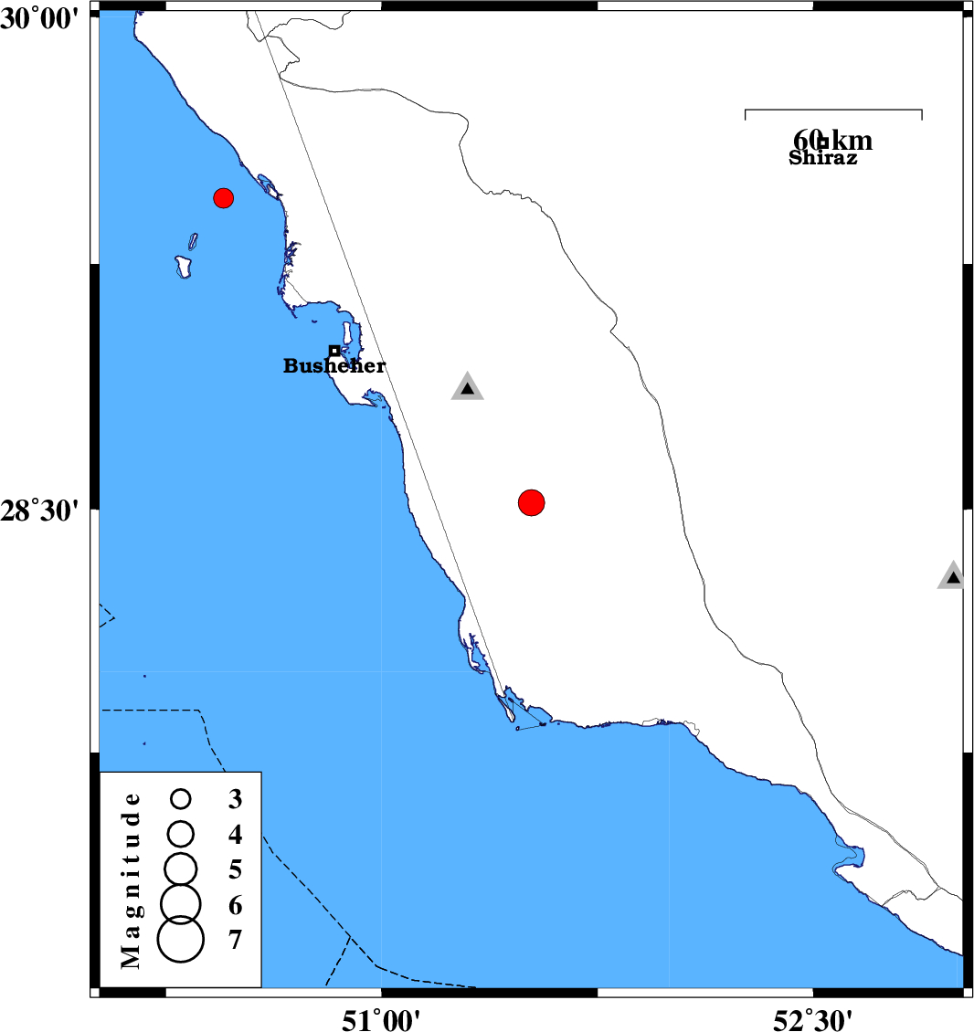 | 2013/04/07 | 04:34:00.8 | 09:04:00.8 | 28.52 | 51.52 | 21 | ML4.1 | Bushehr Province, 21 km South-East of Khormog | ||