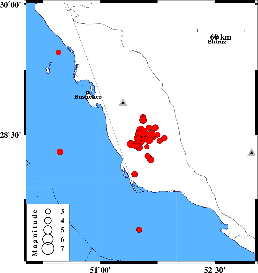 2013/04/09 22:20:45.9 02:50:45.9 28.4551.525 ML4 Bushehr Province, 26 km South-East of Khormog