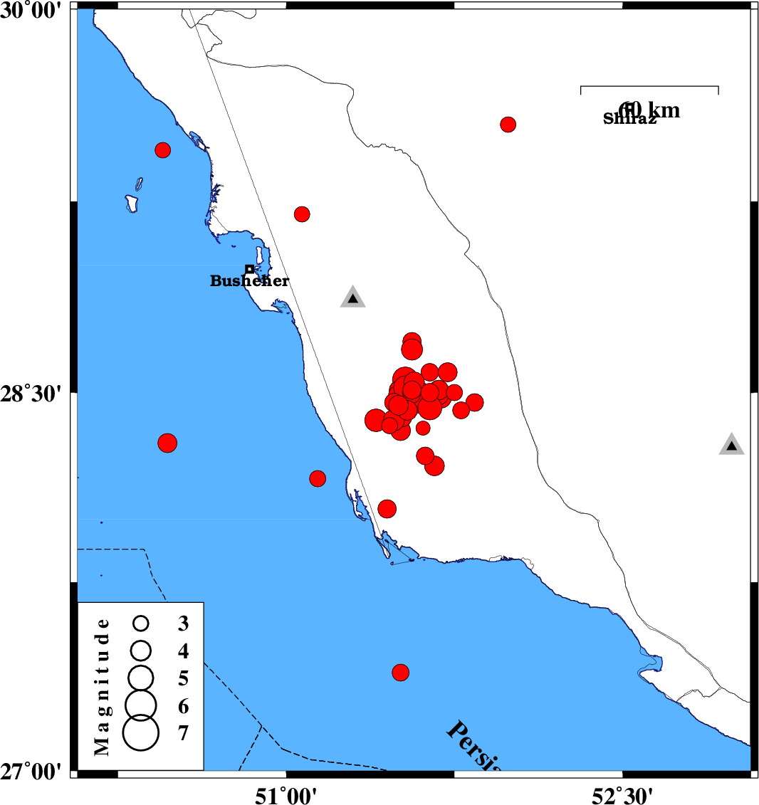 2013/04/09 22:20:45.9 02:50:45.9 28.4551.525 ML4 Bushehr Province, 26 km South-East of Khormog