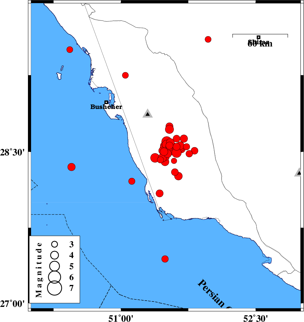 2013/04/09 22:20:45.9 02:50:45.9 28.4551.525 ML4 Bushehr Province, 26 km South-East of Khormog