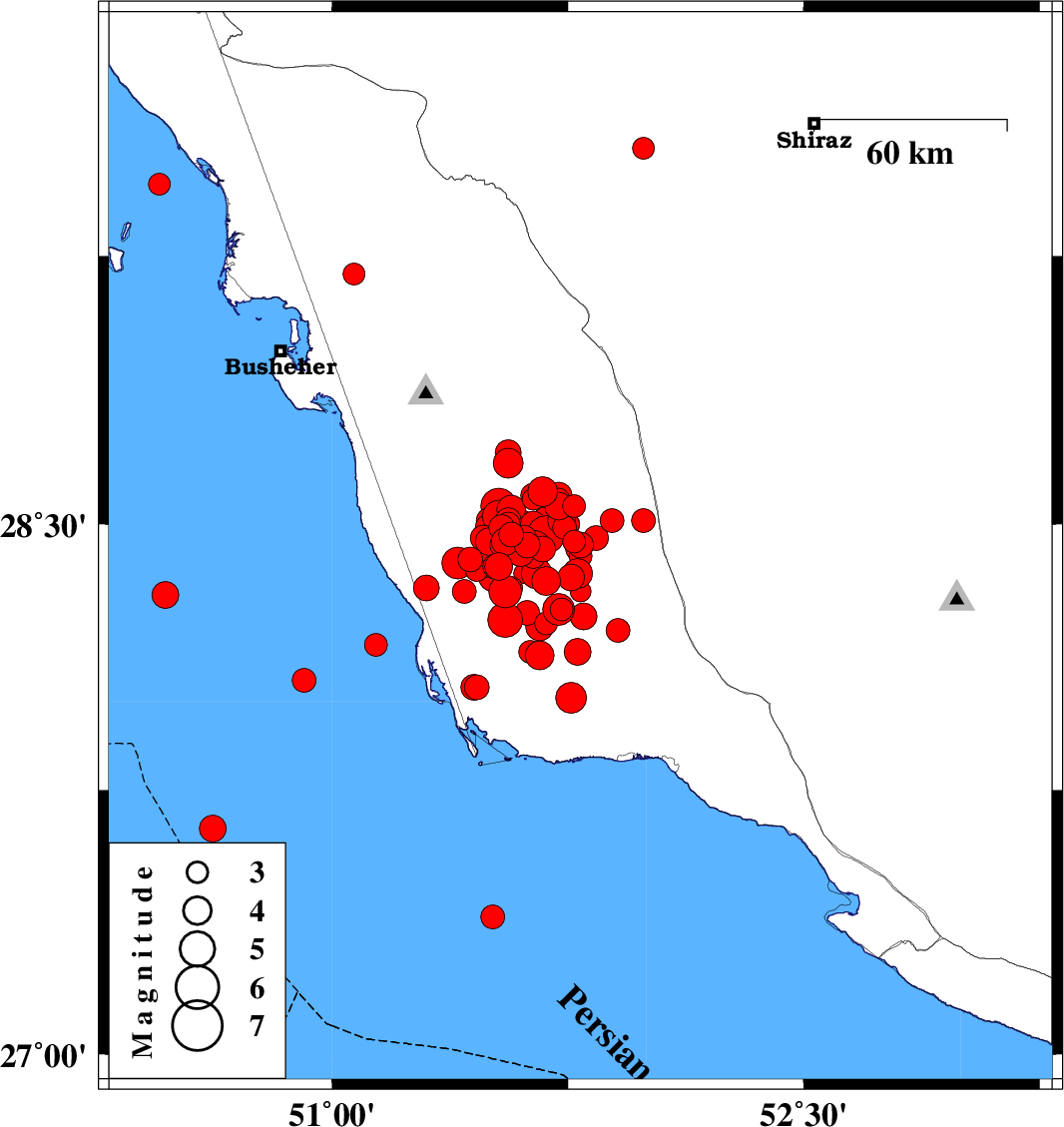 | 2013/04/09 | 21:53:40.6 | 02:23:40.6 | 28.43 | 51.54 | 38 | ML4 | Bushehr Province, 29 km South-East of Khormog | ||