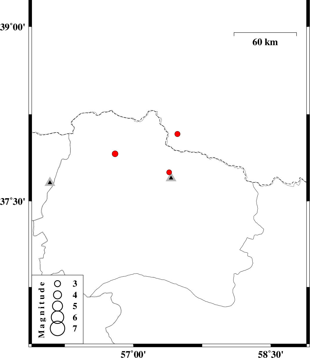 | 2013/04/03 | 01:49:02.3 | 06:19:02.3 | 37.91 | 56.8 | 14 | ML2.9 | Khorasan(north) Province, 42 km North-West of Ashkhaneh |