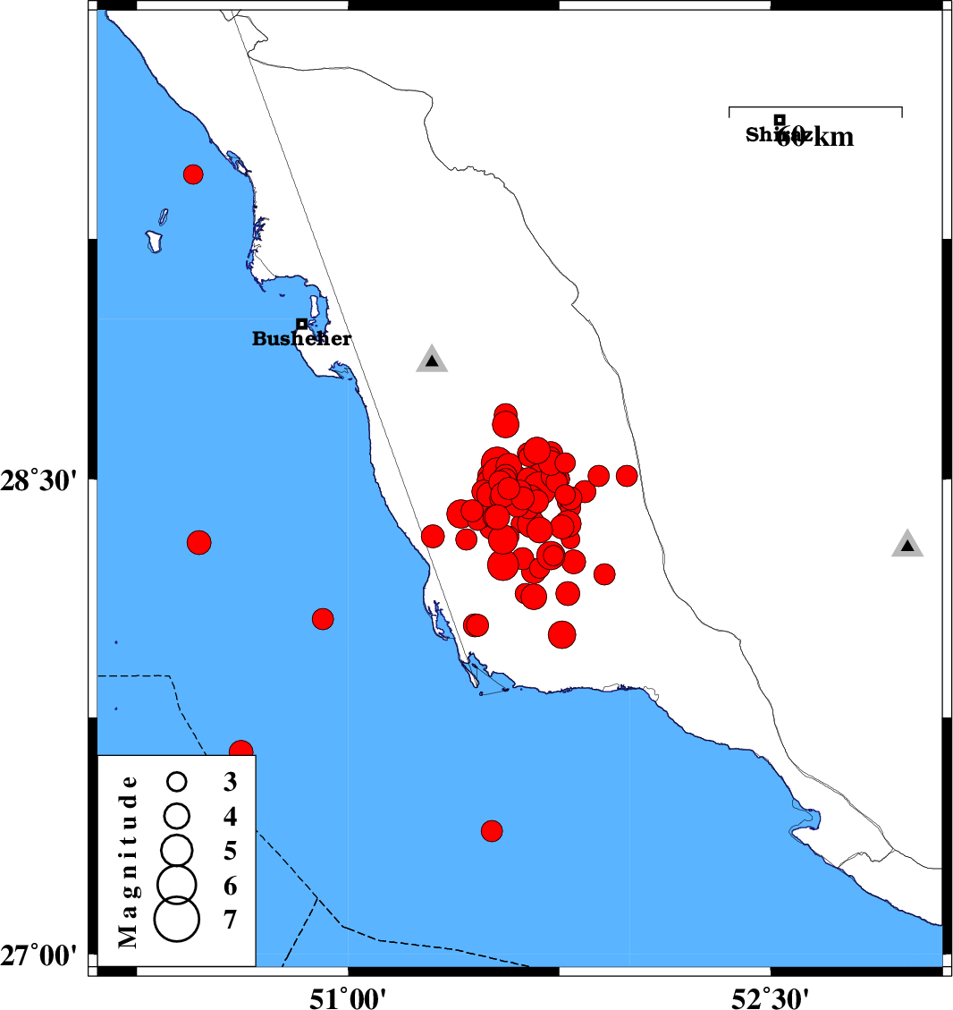 2013/04/10 04:58:02.3 09:28:02.3 28.3151.7920 ML3 Bushehr Province, 55 km South-East of Khormog