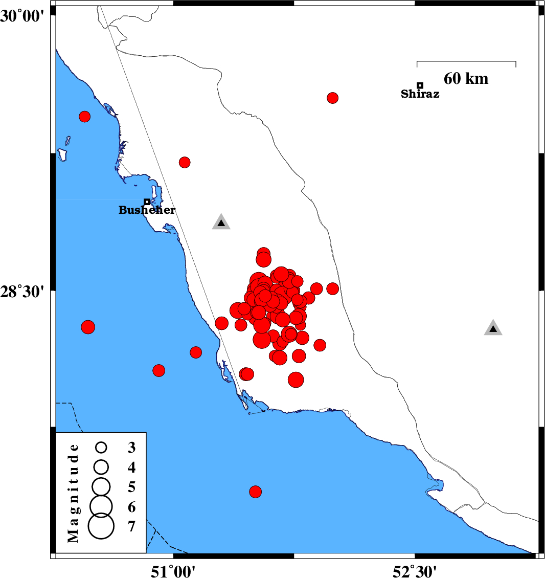 2013/04/10 04:58:02.3 09:28:02.3 28.3151.7920 ML3 Bushehr Province, 55 km South-East of Khormog