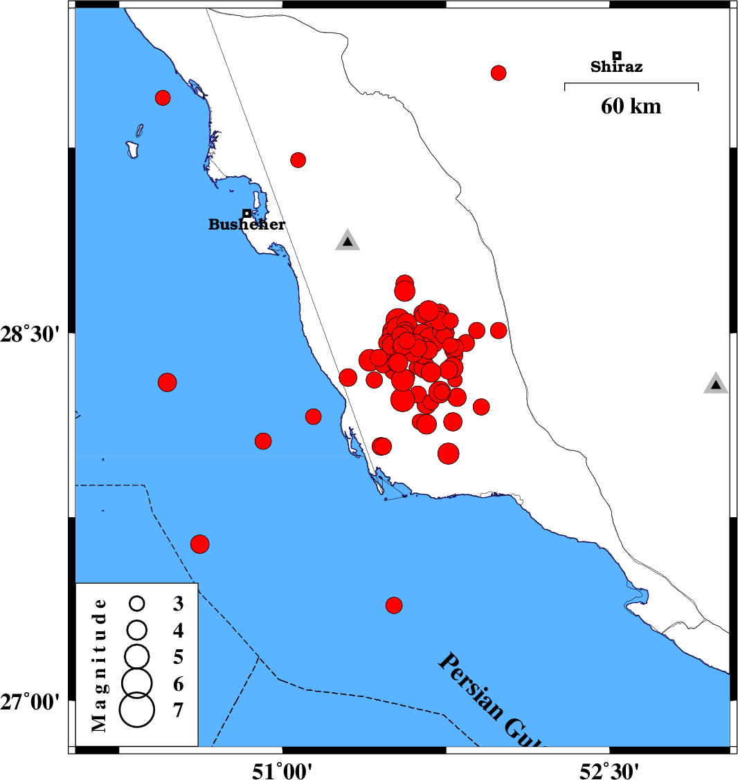 2013/04/10 04:58:02.3 09:28:02.3 28.3151.7920 ML3 Bushehr Province, 55 km South-East of Khormog