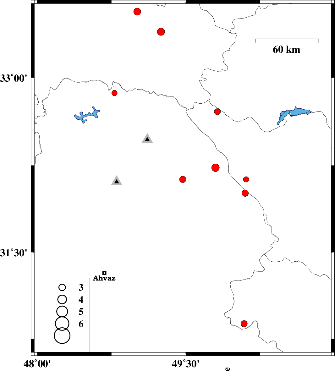 | 2013/03/27 | 15:53:04.2 | 20:23:04.2 | 32.01 | 50.1 | 41 | ML3 | Khoozestan Province, 29 km North-East of Izeh | ||