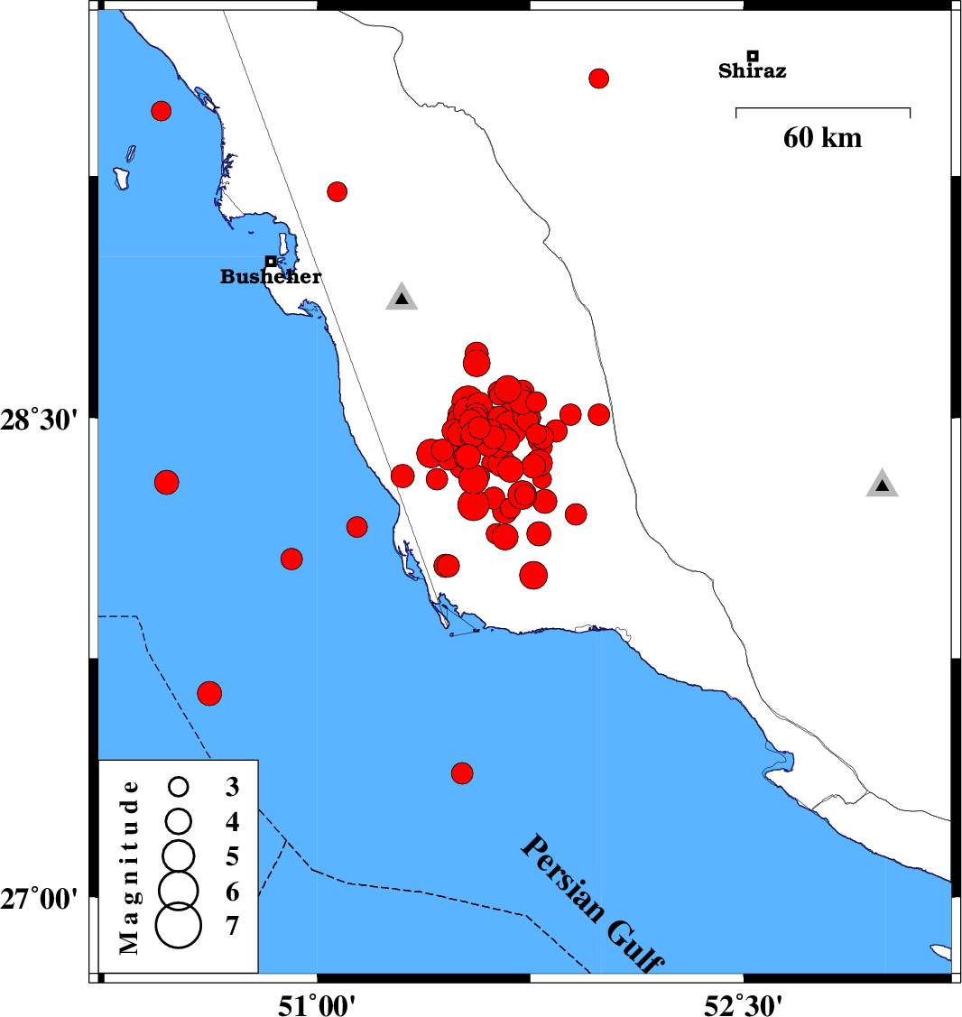 | 2013/04/09 | 15:26:10.8 | 19:56:10.8 | 28.46 | 51.84 | 36 | ML3.5 | Bushehr Province, 50 km South-East of Khormog | ||
