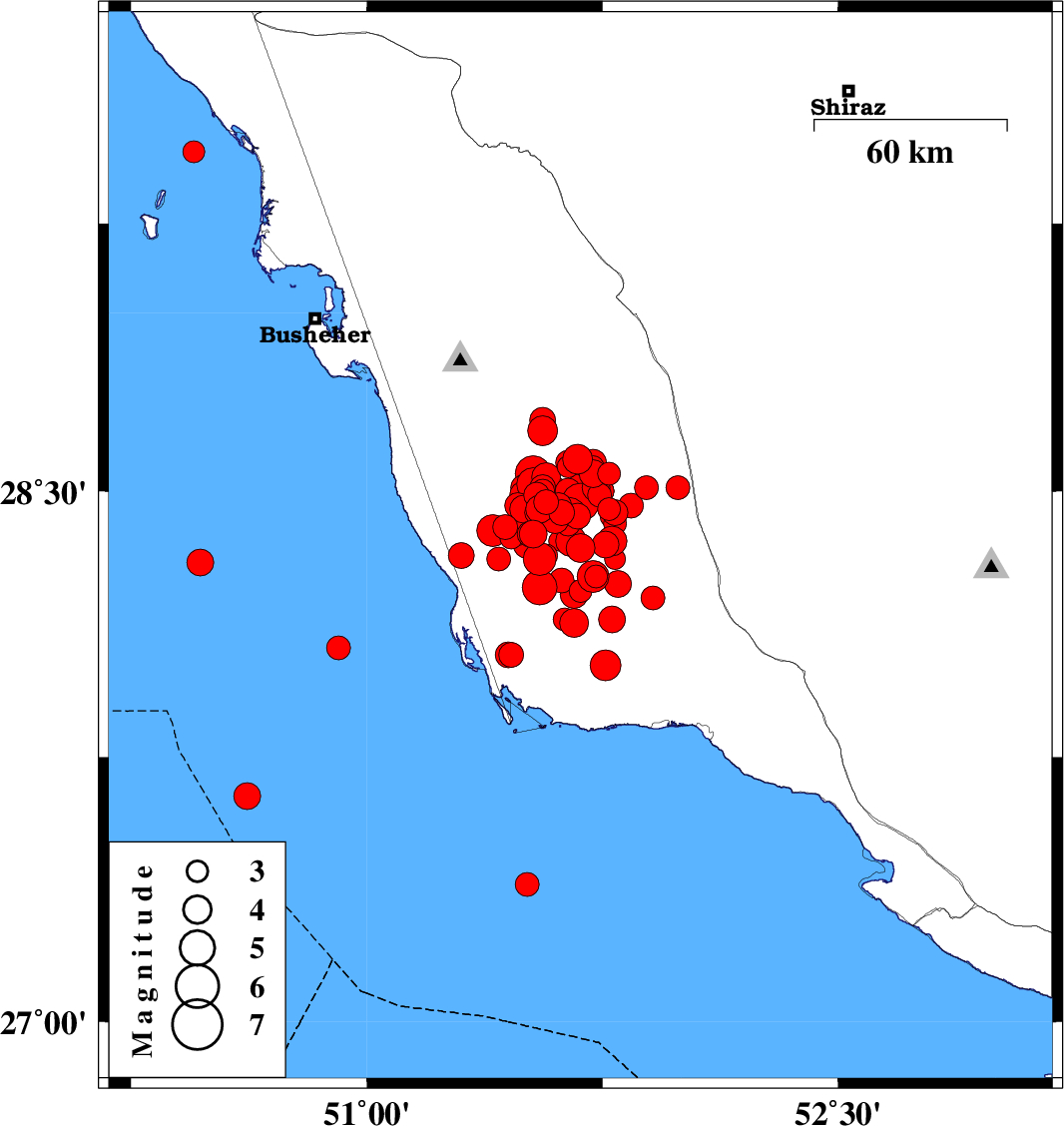 2013/04/10 04:58:02.3 09:28:02.3 28.3151.7920 ML3 Bushehr Province, 55 km South-East of Khormog
