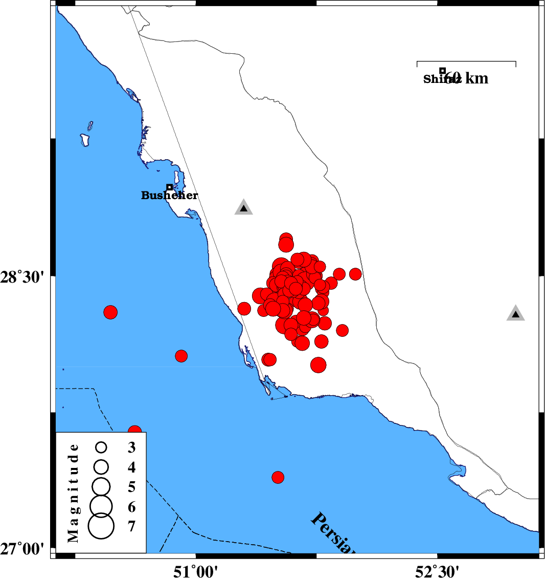 2013/04/10 04:58:02.3 09:28:02.3 28.3151.7920 ML3 Bushehr Province, 55 km South-East of Khormog