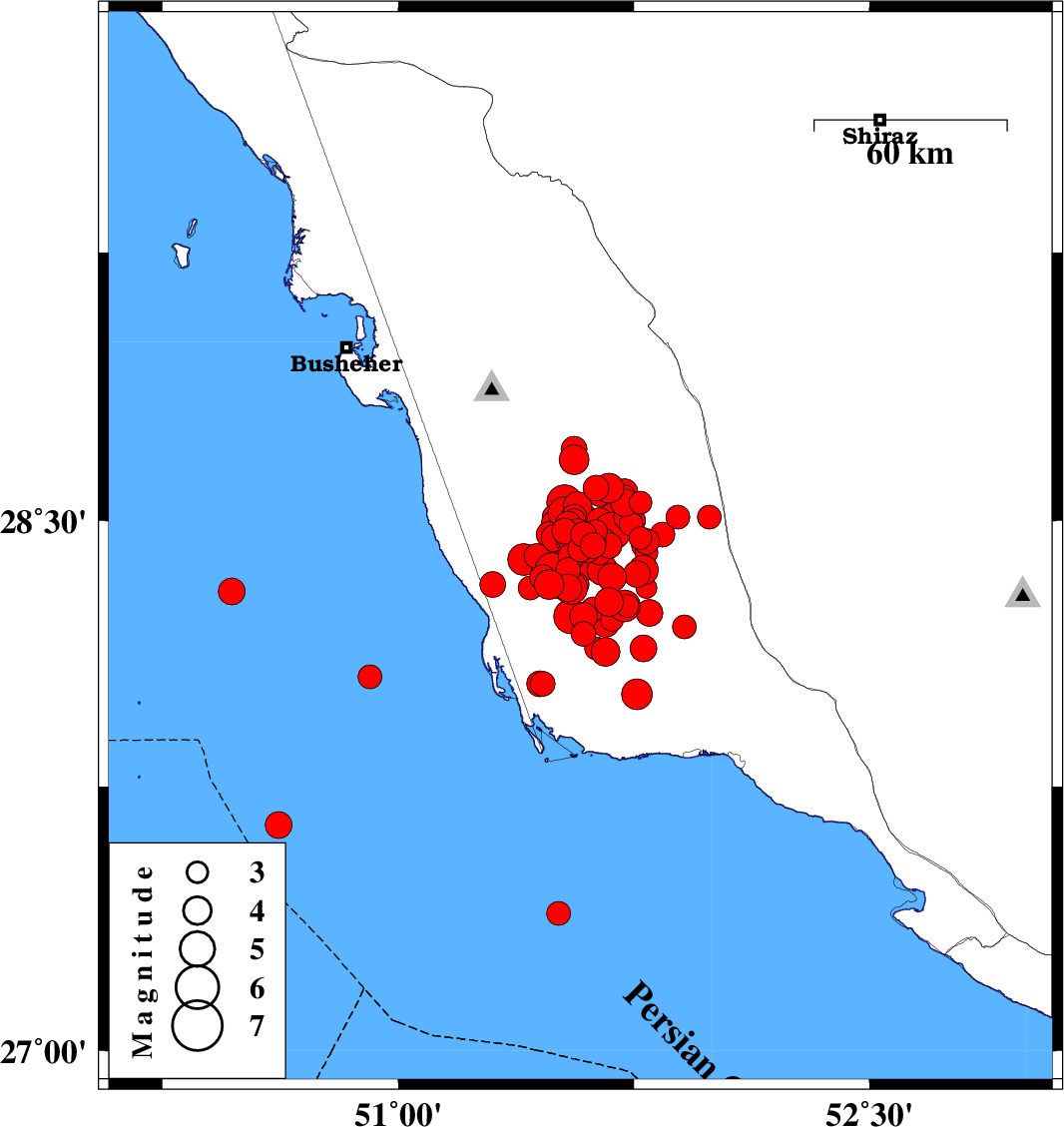 | 2013/04/09 | 11:52:50.4 | 16:22:50.4 | 28.48 | 51.59 | 20 | ML6.2 | Bushehr Province, 29 km South-East of Khormog | ||