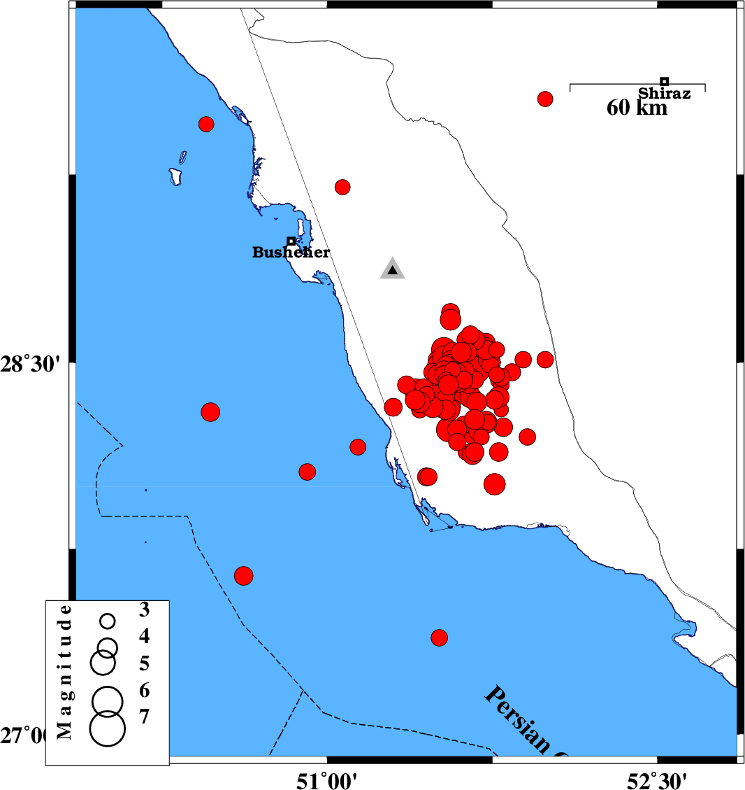 | 2013/04/11 | 09:41:22.4 | 14:11:22.4 | 28.47 | 51.53 | 25 | ML3.7 | Bushehr Province, 26 km South-East of Khormog | ||