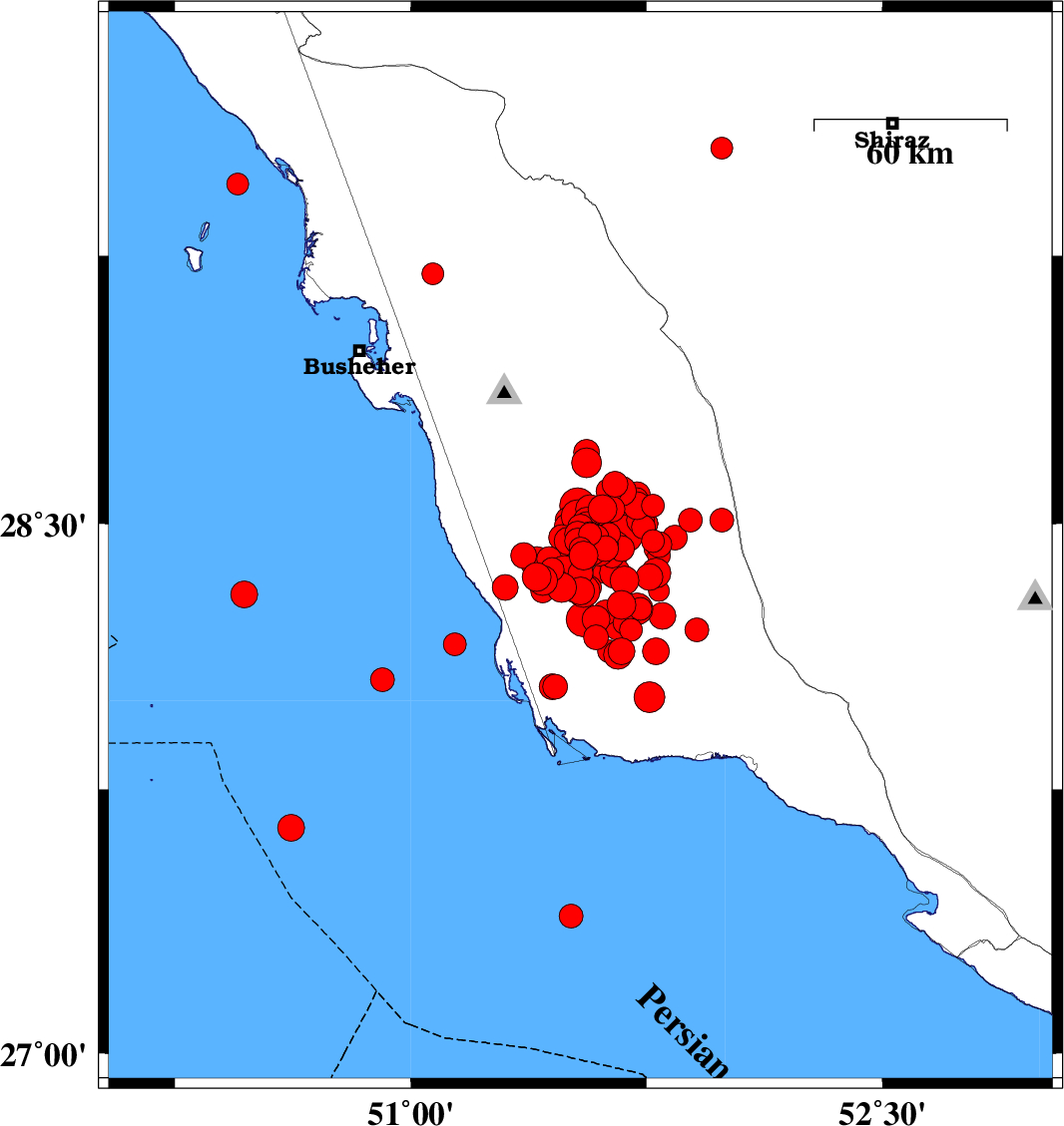 | 2013/04/09 | 14:44:54.2 | 19:14:54.2 | 28.52 | 51.53 | 30 | ML4.6 | Bushehr Province, 21 km South-East of Khormog | ||