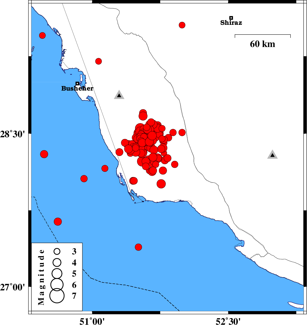 | 2013/04/09 | 18:59:07.2 | 23:29:07.2 | 28.49 | 51.68 | 14 | ML4 | Bushehr Province, 35 km South-East of Khormog | ||