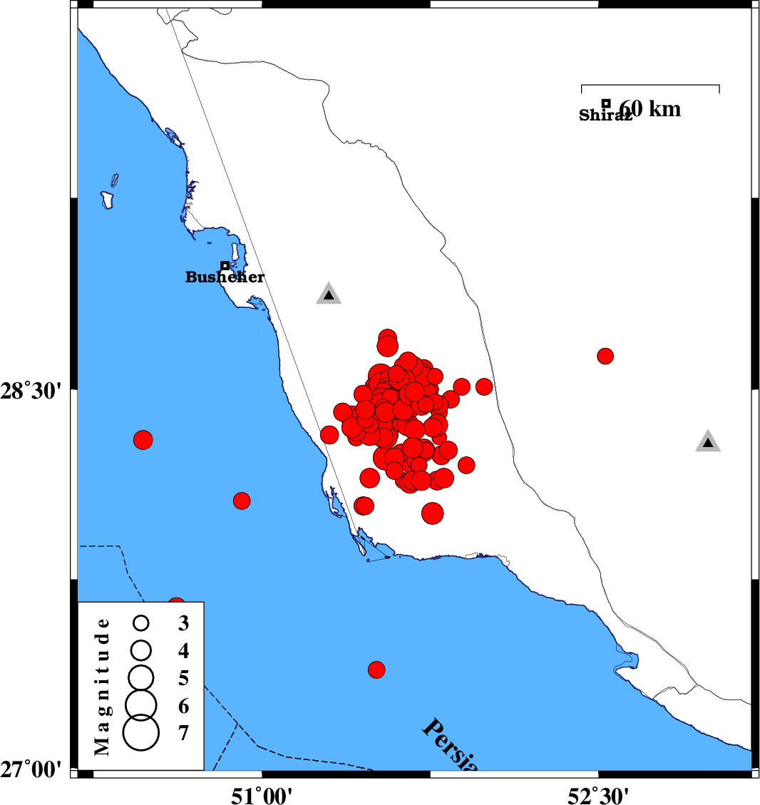 2013/04/09 22:20:45.9 02:50:45.9 28.4551.525 ML4 Bushehr Province, 26 km South-East of Khormog