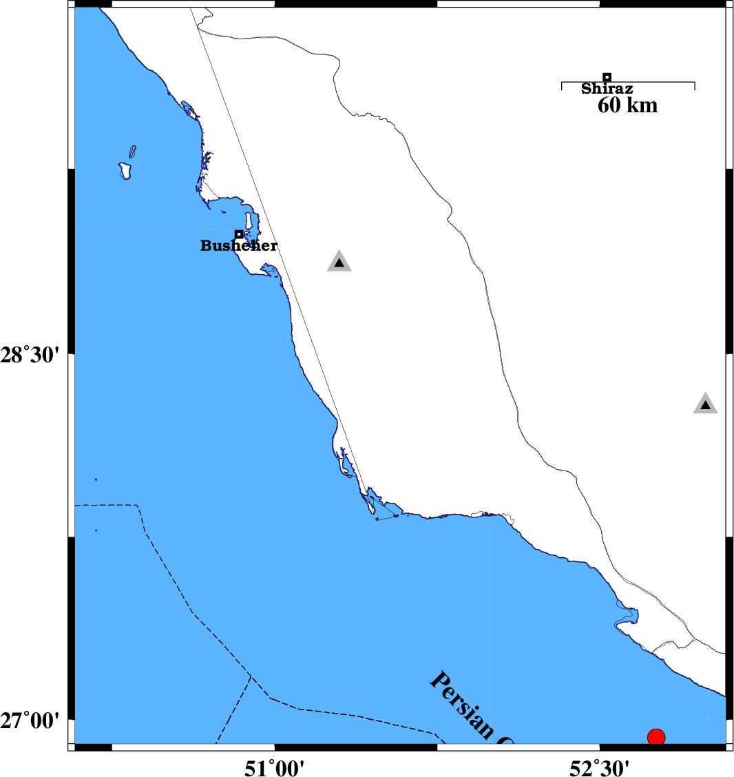 | 2013/04/12 | 07:20:21.9 | 11:50:21.9 | 28.45 | 51.53 | 27 | ML3.6 | Bushehr Province, 27 km South-East of Khormog | ||