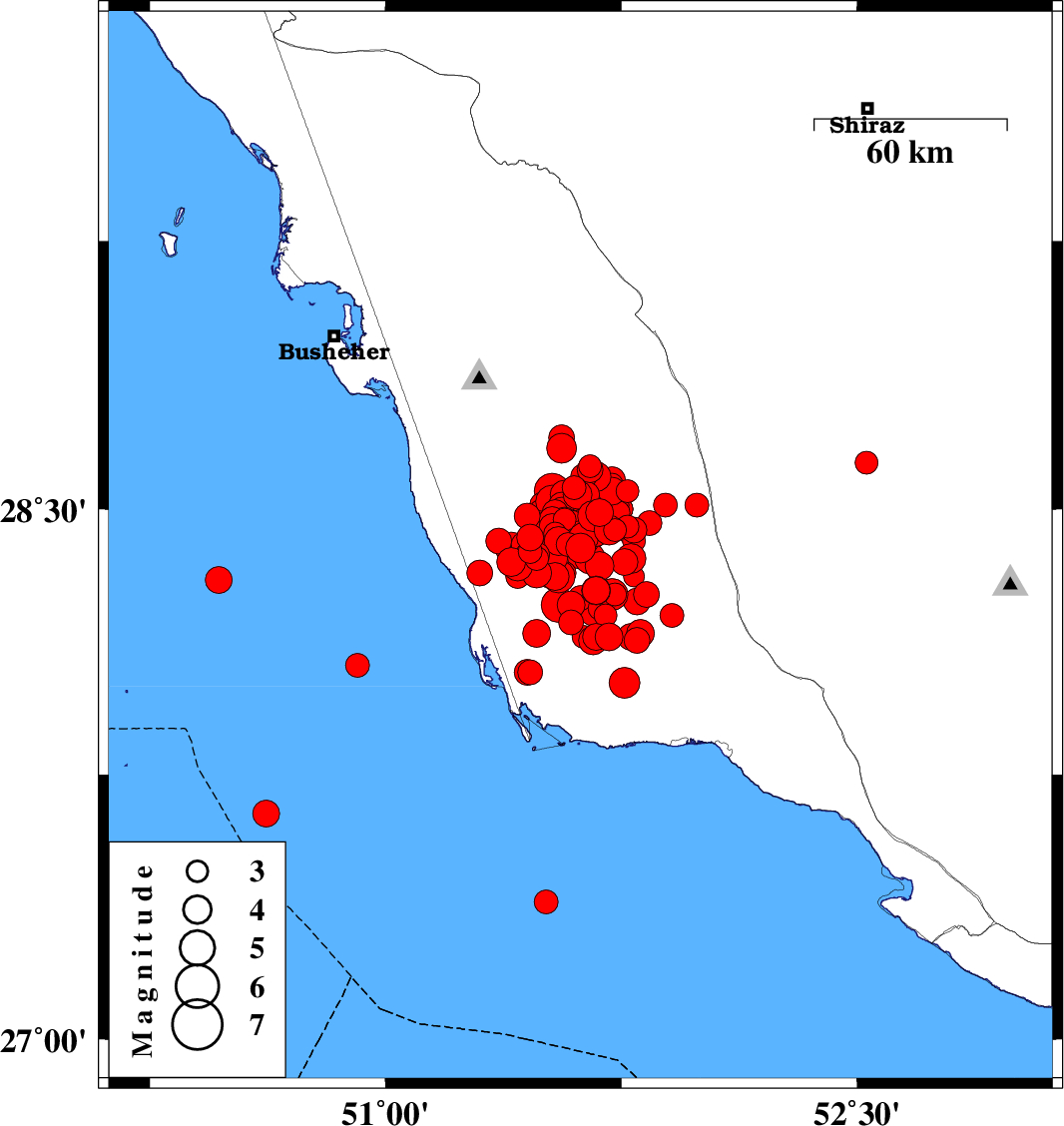 | 2013/04/09 | 18:59:07.2 | 23:29:07.2 | 28.49 | 51.68 | 14 | ML4 | Bushehr Province, 35 km South-East of Khormog | ||