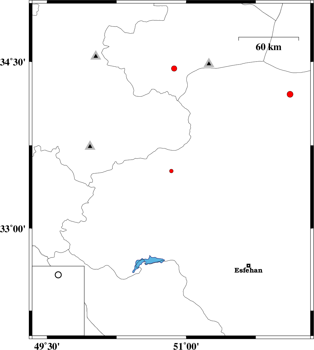 | 2013/04/17 | 14:00:02.9 | 18:30:02.9 | 34.21 | 52.12 | 34 | ML2.9 | Esfahan Province, 62 km North-East of Aran va bidgol | ||